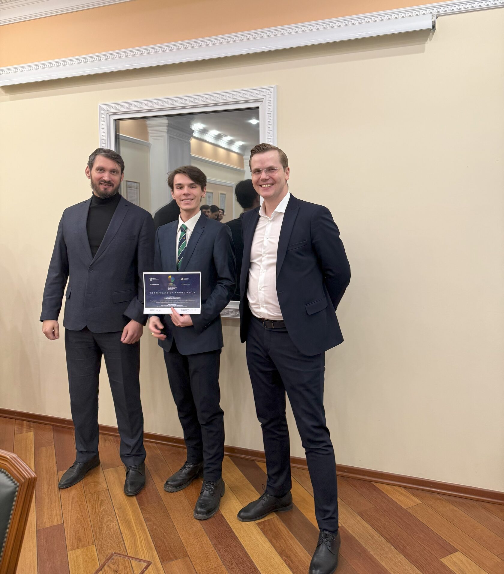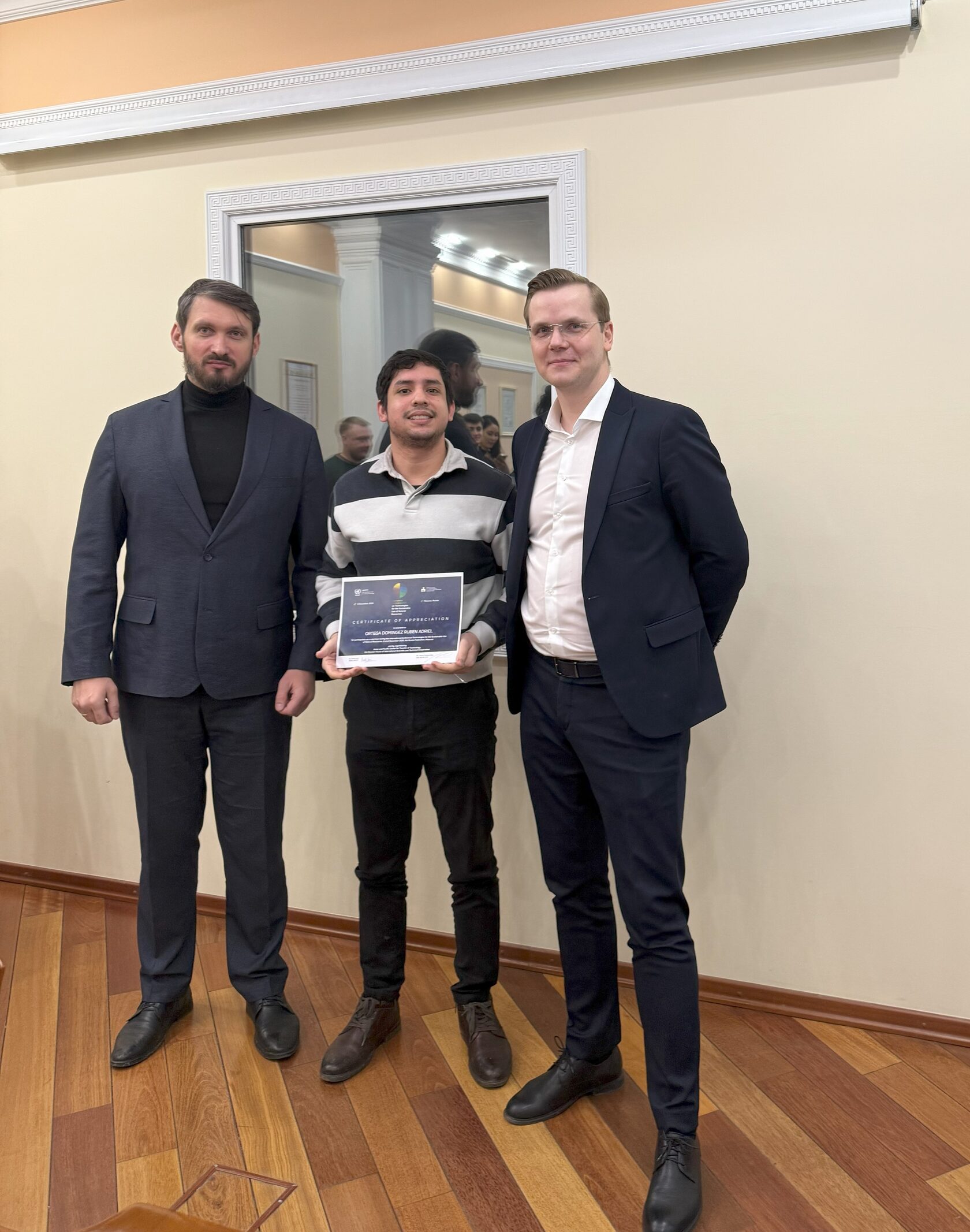 На площадке Финансового университета при Правительстве Российской Федерации 25 декабря состоялась встреча организаторов и волонтеров международной конференции «Технологии рационального использования природных ресурсов». Генеральный директор РД МНТС Дмитрий Протасовский и директор по международной деятельности Финансового университета Анатолий Кисляков вручили участникам мероприятия сертификаты от организаторов - АТЦПТ ЭСКАТО ООН, РД МНТС.