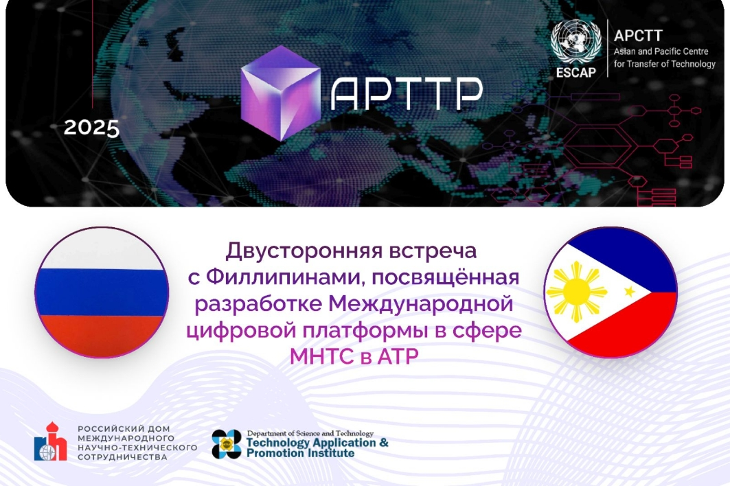 Российский дом международного научно-технического сотрудничества (РД МНТС) провел международную рабочую встречу с представителями Республики Филиппины и Азиатско-Тихоокеанского центра по передаче технологий (АТЦПТ) ЭСКАТО ООН. Встреча состоялась 8 сентября 2025 года в рамках продолжающегося диалога по развитию Международной цифровой платформы в сфере научно-технического и инновационного сотрудничества в АТР (АТР-МНТС), создаваемой совместно с РК Сложные Системы.