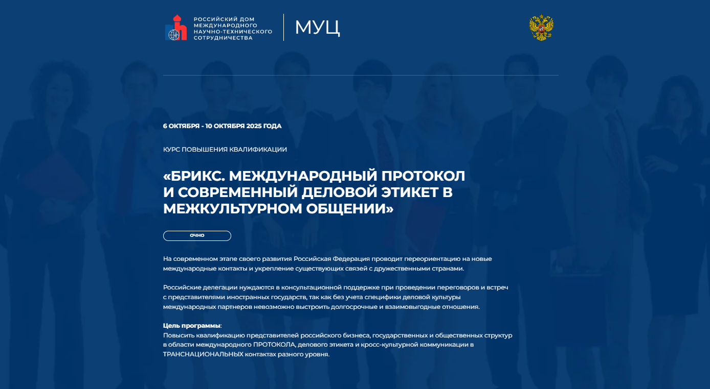 Курс «БРИКС. Международный протокол и современный деловой этикет в межкультурном общении» стартует 6 октября 2025 года в РД МНТС. В течение пяти дней участники смогут глубоко изучить особенности международного протокола, этикета и эффективных деловых коммуникаций с партнёрами из стран БРИКС.